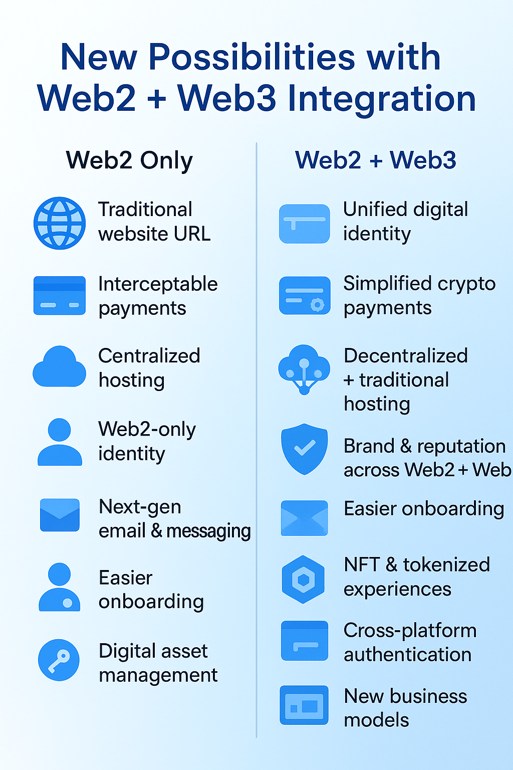 Web2 + Web3 integration transforms domains from just “website addresses” into multifunctional digital identities—blending trust, branding, payments, and decentralized ownership into a single package.